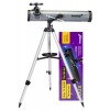 Вилочная азимутальная монтировка позволяет управлять телескопом так же просто, как зрительной трубой. Для наведения на объект достаточно повернуть оптическую трубу в нужную сторону – влево, вправо, вверх или вниз. На вертикальной оси есть микровинт, который нужен для более точной наводки. Высоту алюминиевой треноги можно регулировать, есть полочка для аксессуаров.